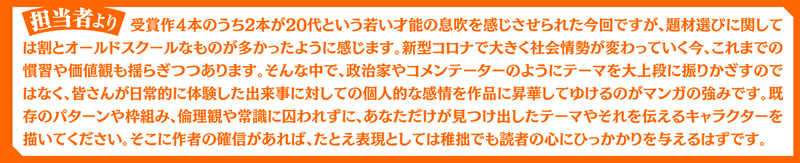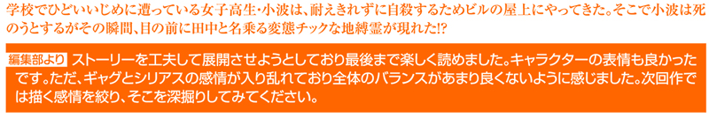 ストーリーを工夫して展開させようとしており最後まで楽しく読めました。キャラクターの表情も良かったです。ただ、ギャグとシリアスの感情が入り乱れており全体のバランスがあまり良くないように感じました。次回作では描く感情を絞り、そこを深掘りしてみてください。