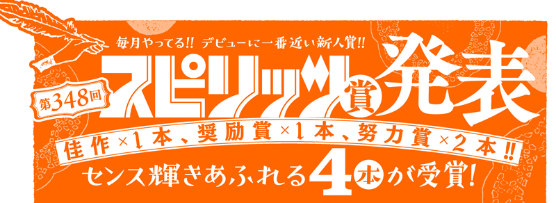 第348回スピリッツ賞に多数のご応募ありがとうございました。受賞作4作を発表いたします。
