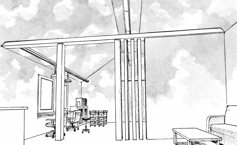 小日向:美容室の中がとにかく大変でした。三角屋根にしちゃったのもあるんですけれど、「青空の美容室」って聞いたときに、天井が高いほうがいいだろうなと思ったんですよね。それで自宅の三角屋根をモデルにして。吹き抜けみたいな空間が身近にあったので想像しやすかったんですけど、実際にはパースを取るのがすごく大変で、とっても苦労しました。単行本のあとがきにはそのあたりの苦労と、美容室の間取り図を収録しています。あと、美容室内の青空を水彩でいい感じに描くのも難しくて、そこも苦労しました。美容室の空は水彩、外にある現実の空はペンで、と描き分けています。
