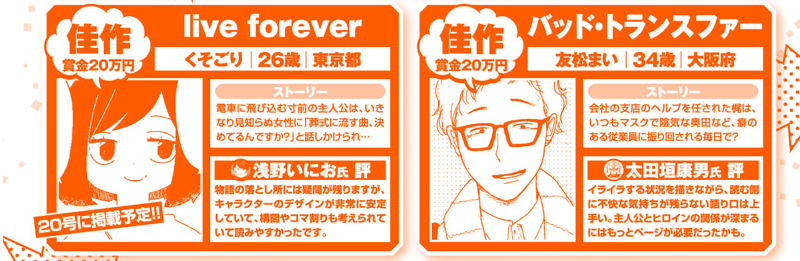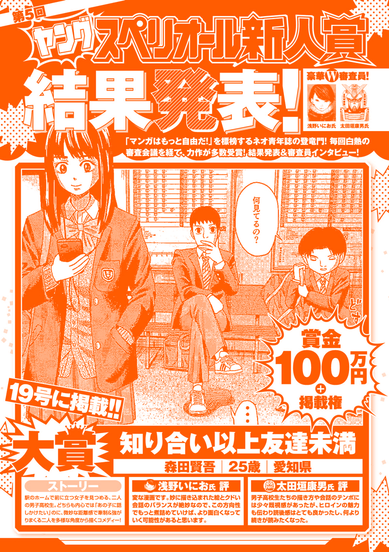 第5回ヤングスペリオール新人賞に多数のご応募いただき、ありがとうございました。今回は総数で40作品ご応募いただき、厳正な審査の結果『知り合い以上友達未満』(森田賢吾氏)の大賞受賞となりました。審査の過程では浅野いにお先生が推す『バッド・トランスファー』、太田垣康男先生が推す『知り合い以上友達未満』、編集部員の採点で最も評価が高かった『live forever』など、良い意味で意見が大きく分かれましたが、「将来性を強く感じる」という理由で『知り合い以上友達未満』の大賞受賞が決定しました。