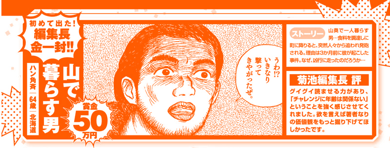 また、独特の雰囲気を醸し出す魅力的な作品『山で暮らす男』を、還暦越えにも関わらず投稿してくださったハン角斉氏に対して、初めて編集長金一封50万円を贈呈することにもなりました。大変「豊作」な回だったと思います。