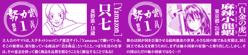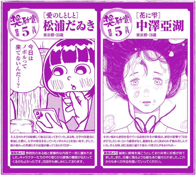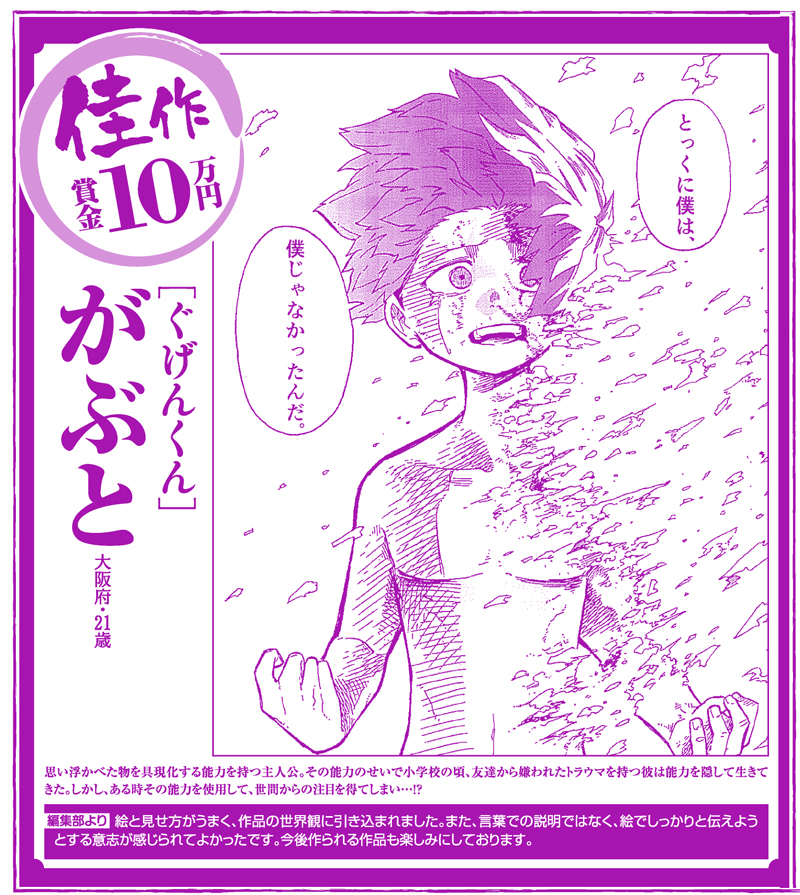 スピリッツ賞へのご応募ありがとうございました。今回は佳作1本、奨励賞2本、努力賞2本の計5作品が受賞しました。佳作の『ぐげんくん』はタイトルどおり、主人公が見たものをそのまま「具現化」できる能力を持ち合わせていることがさまざまな出来事を引き起こす、というストーリーでした。作中ではセリフを極力割愛し、内容をできる限りわかりやすく絵で見せることに腐心した努力がうかがえました。奨励賞の2作品は感情表現に特化した作りを徹底していたのが印象的です。また、努力賞2作につきましても将来性を感じさせるものがあり、今後に期待したいです。今、数多くの作品が世に並ぶ中でどうやったら自分の作品をストレートに伝え、読者に伝わるかを常に考え、漫画の中でその工夫を実践していってほしいと願います。今後も皆様の「読者・相手を意識した」力作をお待ちしております。