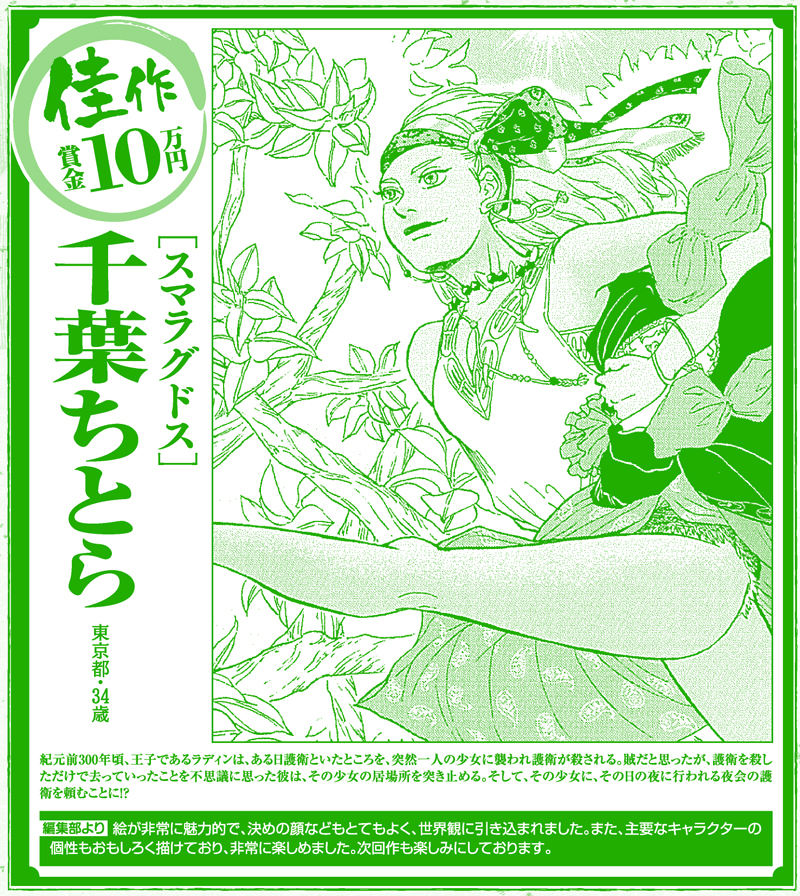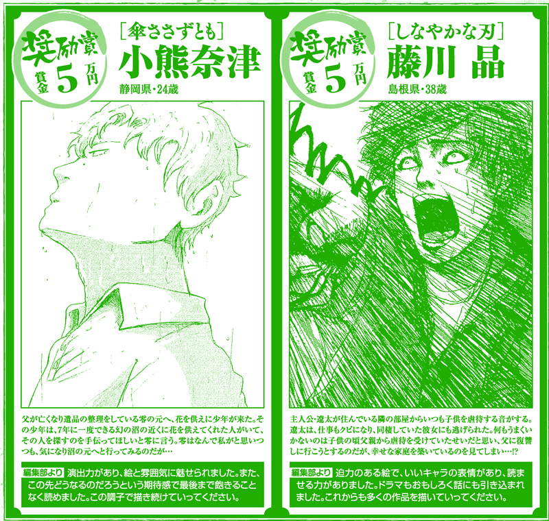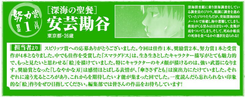 スピリッツ賞への応募ありがとうございました。今回は佳作1本、奨励賞2本、努力賞1本と受賞作が4本となりました。中でも佳作を受賞した『スマラグドス』は、生き生きとしたキャラクター描写がとても魅力的で、もっと見たいと思わせる「絵」を描けていました。特にキャラクターのキメ顔が描けるのは、強い武器になります。奨励賞となった『しなやかな刃』は感情ほとばしる表情が、『傘ささずとも』は演出力にたけていました。それぞれに違う光るところがあり、これからを期待したい才能が集まった回でした。一度読んだら忘れられない印象的な「絵」作りをぜひ目指してください。編集部では皆さんの作品をお待ちしています!