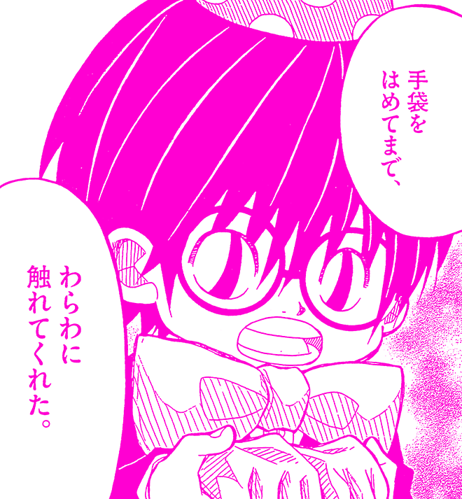 高 正直、この作品がコメディーであることを忘れてしまうくらい辛い話でした…でも私もコタローくんに対して、「手袋を捨てろ」とは言えないですね。それだけコタローくんにとって大切なものだっていうのがわかるだけに。でも、ゆくゆくは大人になったコタローくんがビニール手袋を使っていた母親の心理に気づいてしまうだろうから、その時のことを想像すると本当辛い…切なすぎる話ですよね。