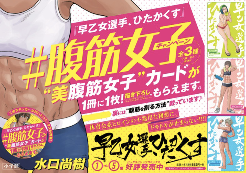 体育会系ヒロインの不器用な初恋を描いた『早乙女選手、ひたかくす』。5集の発売を記念して、描き下ろし“美腹筋女子”カードがもらえるキャンペーンを一部書店にて実施します。