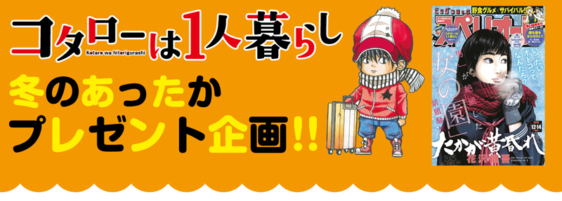 現在発売中のビッグコミックスペリオール24号(紙版のみ)で、雑誌についてる応募券をハガキに貼って応募してくれた読者に、抽選で計100名に当たる『コタローは1人暮らし』特製ネックウォーマープレゼント企画を実施中。応募の締め切りは12月14日(金)で当日消印有効。
