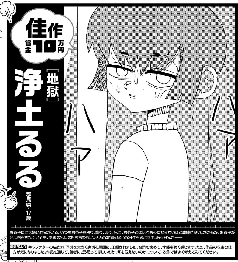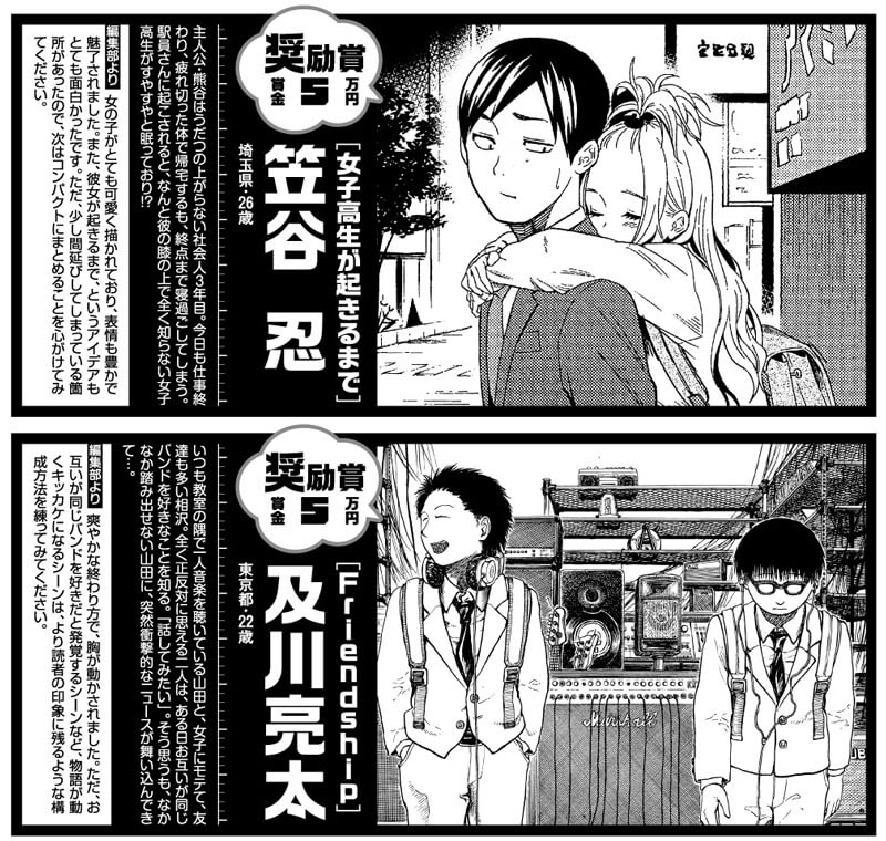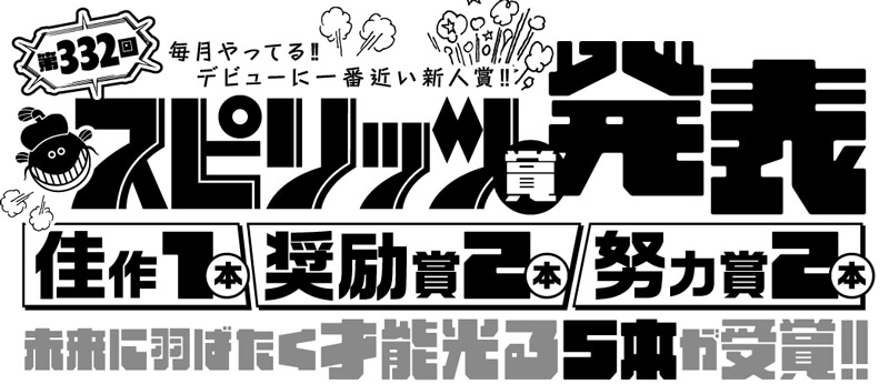 受賞者の皆様、おめでとうございます。スピリッツ賞は「毎月やってる!デビューに一番近い新人賞」です。皆様のご応募、お待ちしています。