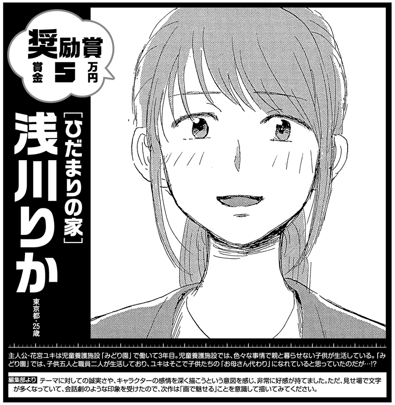 スピリッツ賞へのご応募、ありがとうございます。そして、受賞者の皆さんおめでとうございます。今回は受賞作が3本と少なく、佳作以上がでないという結果となりました。しかし、浅川りかさんの『ひだまりの家』は社会に向き合おうという意志があり、またテーマ、細部に対する誠実さを感じ、好感が持てました。ここから一歩進んで、どうやったら読者が興味を持ってくれるか、どうすれば最後まで興味を持って読んでもらえるか、エンタメ性を追及すれば、作品として一段上がれると思います。読者は沢山の作品に出会うので、少しでもピンとこないものは、すぐに読むのをやめてしまいます。気になって手に取ってしまう絵柄、飽きさせない展開、唯一無二の見せ場、そういった作品をお待ちしています!