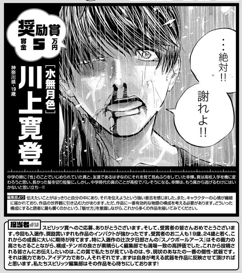 第338回スピリッツ賞に多数のご応募ありがとうございました。受賞作2作を発表いたします。