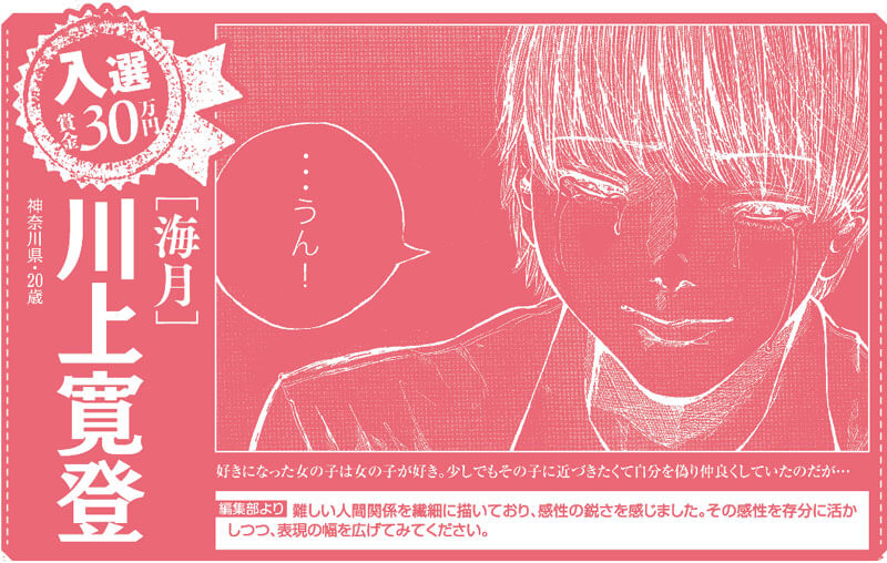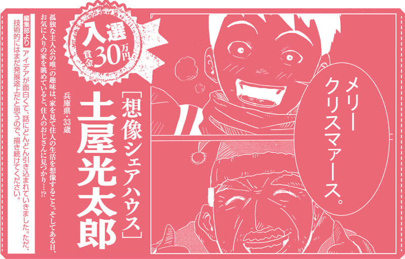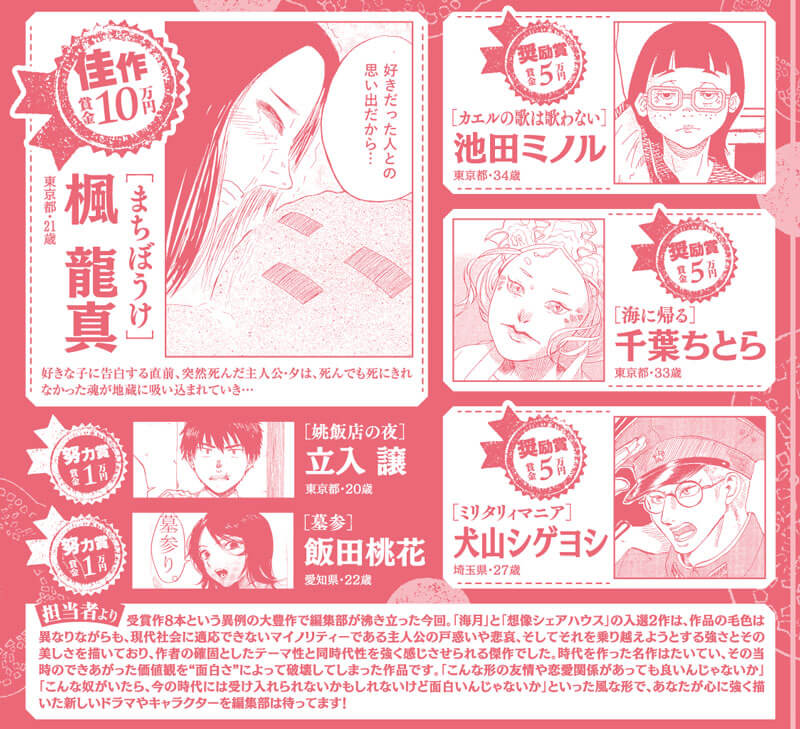 受賞作8本という異例の大豊作で編集部が沸き立った今回。「海月」と「想像シェアハウス」の入選2作は、作品の毛色は異なりながらも、現代社会に適応できないマイノリティーである主人公の戸惑いや悲哀、そしてそれを乗り越えようとする強さとその美しさを描いており、作者の確固としたテーマ性と同時代性を強く感じさせられる傑作でした。時代を作った名作はたいてい、その当時のできあがった価値観を“面白さ”によって破壊してしまった作品です。「こんな形の友情や恋愛関係があっても良いんじゃないか」「こんな奴がいたら、今の時代には受け入れられないかもしれないけど面白いんじゃないか」といった風な形で、あなたが心に強く描いた新しいドラマやキャラクターを編集部は待ってます!