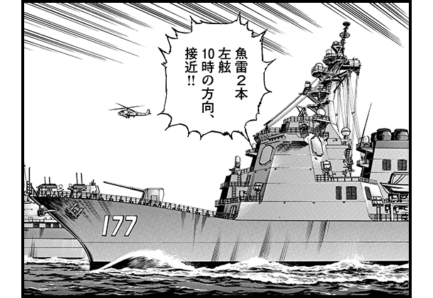 イージスミサイル護衛艦DDG177「あたご」。第5護衛隊群所属。艦長・浦田鉄人一佐。20XX年の尖閣上陸事件時には、調査目的という名目で佐世保基地より出航。その際、中国軍の空母「寮寧」の艦載機・殲15から威嚇を目的としたミサイル攻撃を受けた経験を持つ。当時の艦長は湧井継治一佐(現在は海将補へ昇進し、第5護衛隊群の群司令となっている)。第5護衛隊群にもう一隻所属しているイージス艦「ちょうかい」よりも多数の火砲を搭載しており、対空・対艦だけでなく対地攻撃も可能。