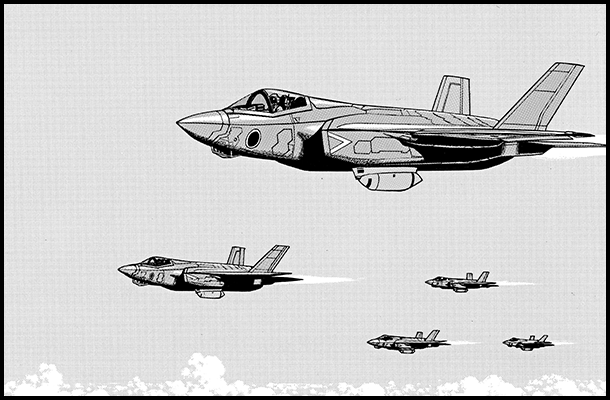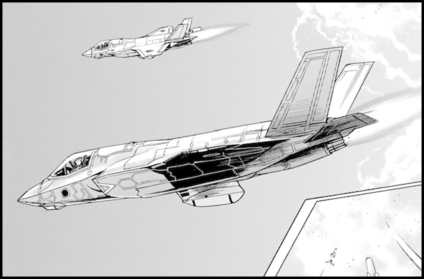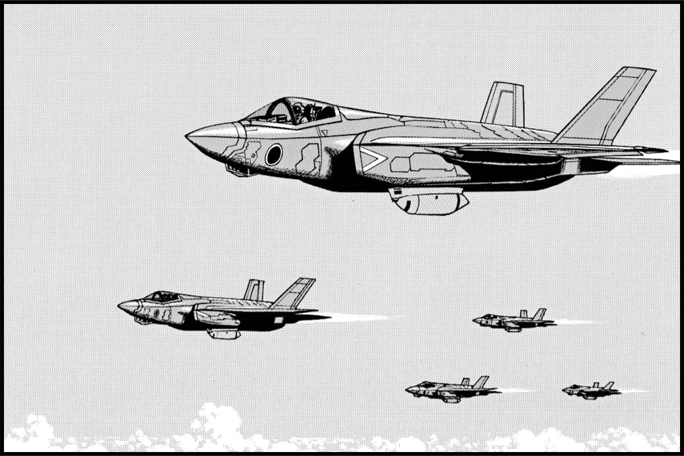 対潜戦闘目的として、いぶきにのみ15機搭載されている新型艦載ステルス機。最高速度はマッハ1.5。射程距離70キロの空対空ミサイル AIM120アムラームを搭載。機体6ヶ所に設置された赤外線カメラにより、真下を含む機の全周が可視化され、ヘルメット装着型表示装置(HMD)を通してパイロットのバイザーに視覚化表示。HDMはパイロットが顔を向けた方向にミサイル照準が可能なことから、神の眼という異名を持つ。第92航空団に所属。団司令兼飛行隊長・渕上晋一佐。1機あたりの価格は150億円。